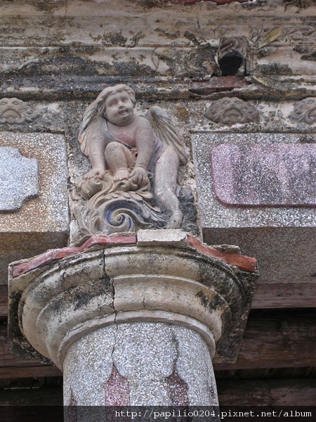 從這棟洋樓裝飾的構件來看,當初興建時並沒有花費太大的心思在於外表的裝飾。正立面山頭使用的彩色瓷磚是現成的,柱頭的天使像、水車堵飾帶的花樣也都是從廈門進口預鑄好的灰泥成品,若真要說特殊的,那就是整個建築體採用的熱帶鮮豔粉紅色調,讓人們不會太去注意到其他的裝飾元素。